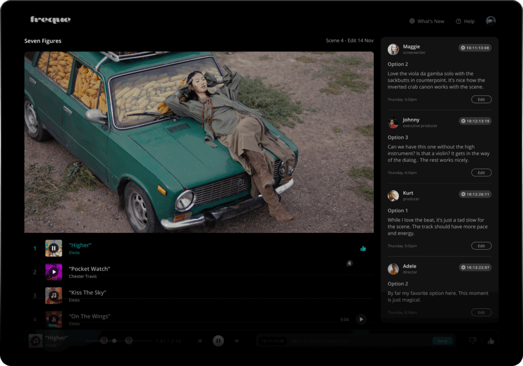 Freque keeps composers creative by getting through the feedback part faster. Easily mange notes on score with picture and get back to writing your soundtrack.