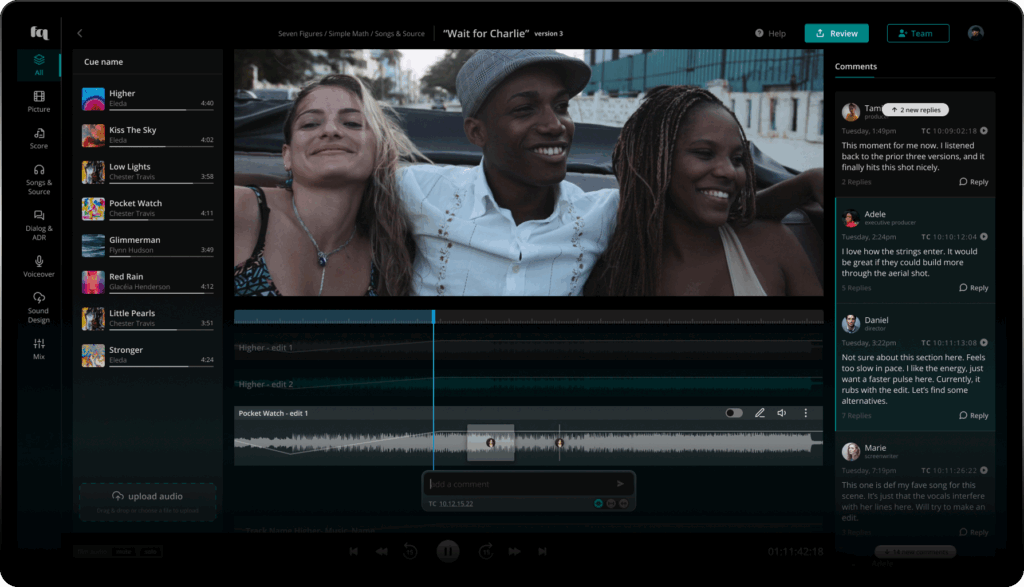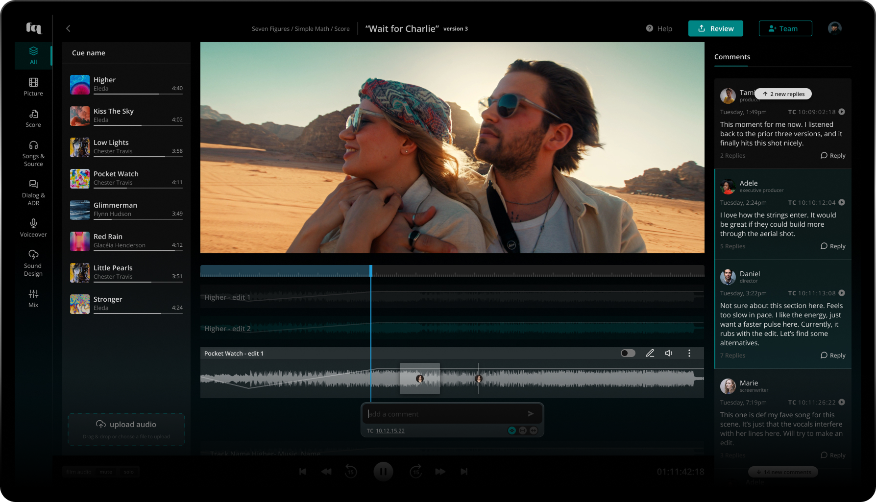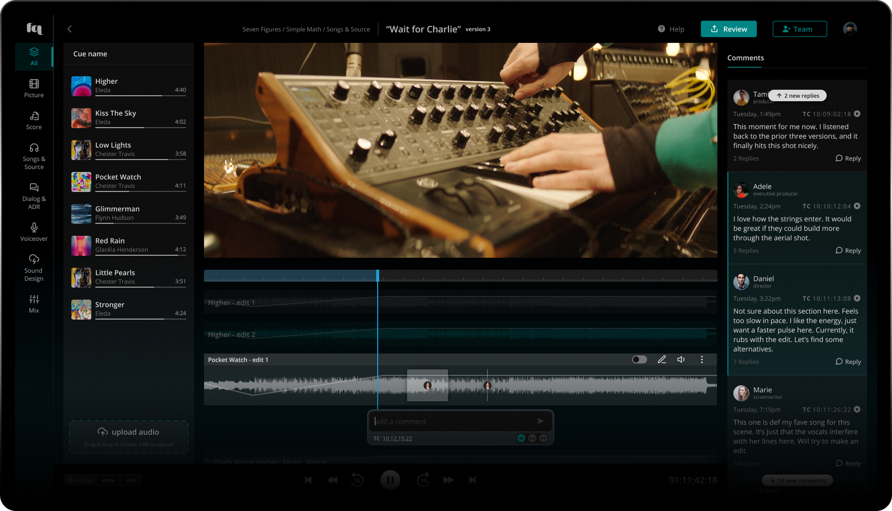 Picture music and sound each get a lane and playback in sync. Upload your film then upload score and manage all versions and feedback under one video.