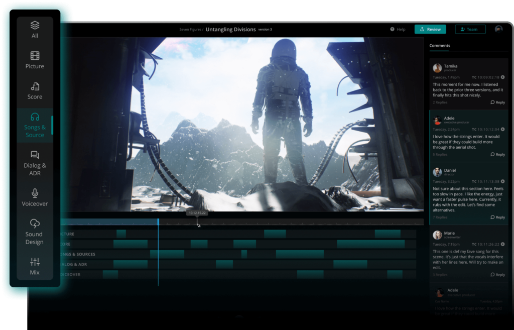 Picture music and sound each get a lane where you can upload media and synchronize for review.  Share song and b-roll options (coming soon), score versions, sound design, voice over takes playable with your edit.  See what it feels like to work at the speed of creativity.