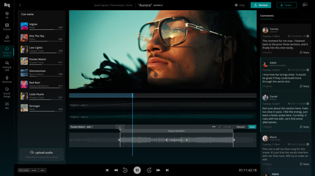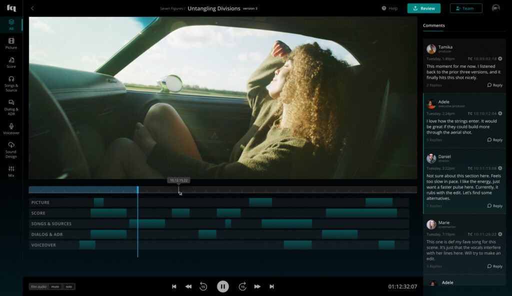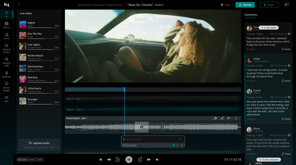 Freque takes video review to the next level by allowing you to upload an edit and add song options, score cues, b-roll options (coming soon), sound design, voice over takes.  All viewable within your edit.