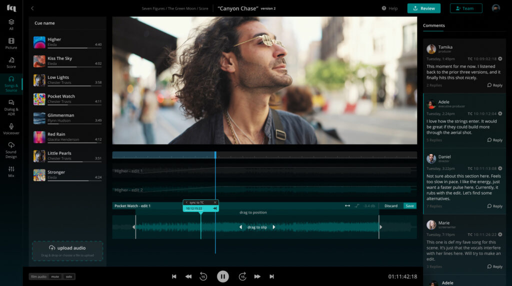 Freque takes video review to the next level by allowing you to upload an edit and add song options, score cues, b-roll (coming soon), sound design or voice over takes.  All viewable within your edit.